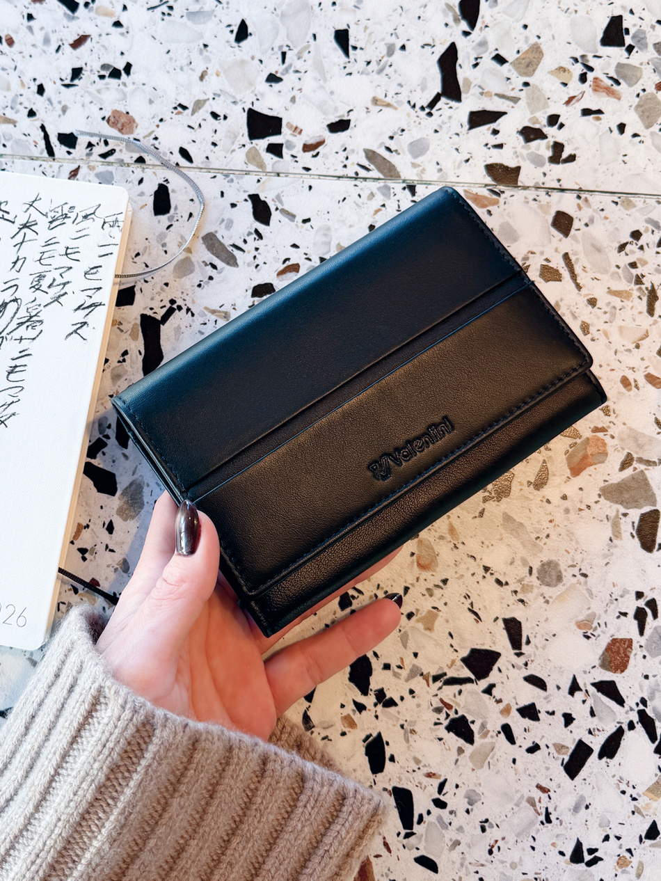 Kolekcja skórzanych portfeli Milford marki Valentini to propozycja klasycznych portfeli. Modele damskie i męskie wykonano z miękkiej skóry o lekko widocznej strukturze. Portfele są bardzo lekkie, cienkie i elastyczne, dzięki czemu nawet wypełnione zachowują elegancki charakter. Prezentowany średniej wielkości portfel damski posiada bardzo popularny wśród Polek układ poziomy. Wnętrze obszyte jest wysokiej jakości miękką skórą cielęcą. Ten doskonale zaprojektowany model posiada dwa miejsca na banknoty, miejsce na bilon zamykane na suwak, siedem miejsc na kartę kredytową oraz trzy miejsca na dokumenty. Optymalny rozmiar portfela oraz rozmieszczenie przegródek zadowoli każdą użytkowniczkę. Kolekcja Valentini Milford jest klasyczna i elegancka, dlatego portfele zostały pozbawione zbędnych ozdobników. Logo marki zostało wytłoczone na froncie oraz wewnątrz portfela. Polecamy tę kolekcję nie tylko jako zakup osobisty, ale również na prezent.