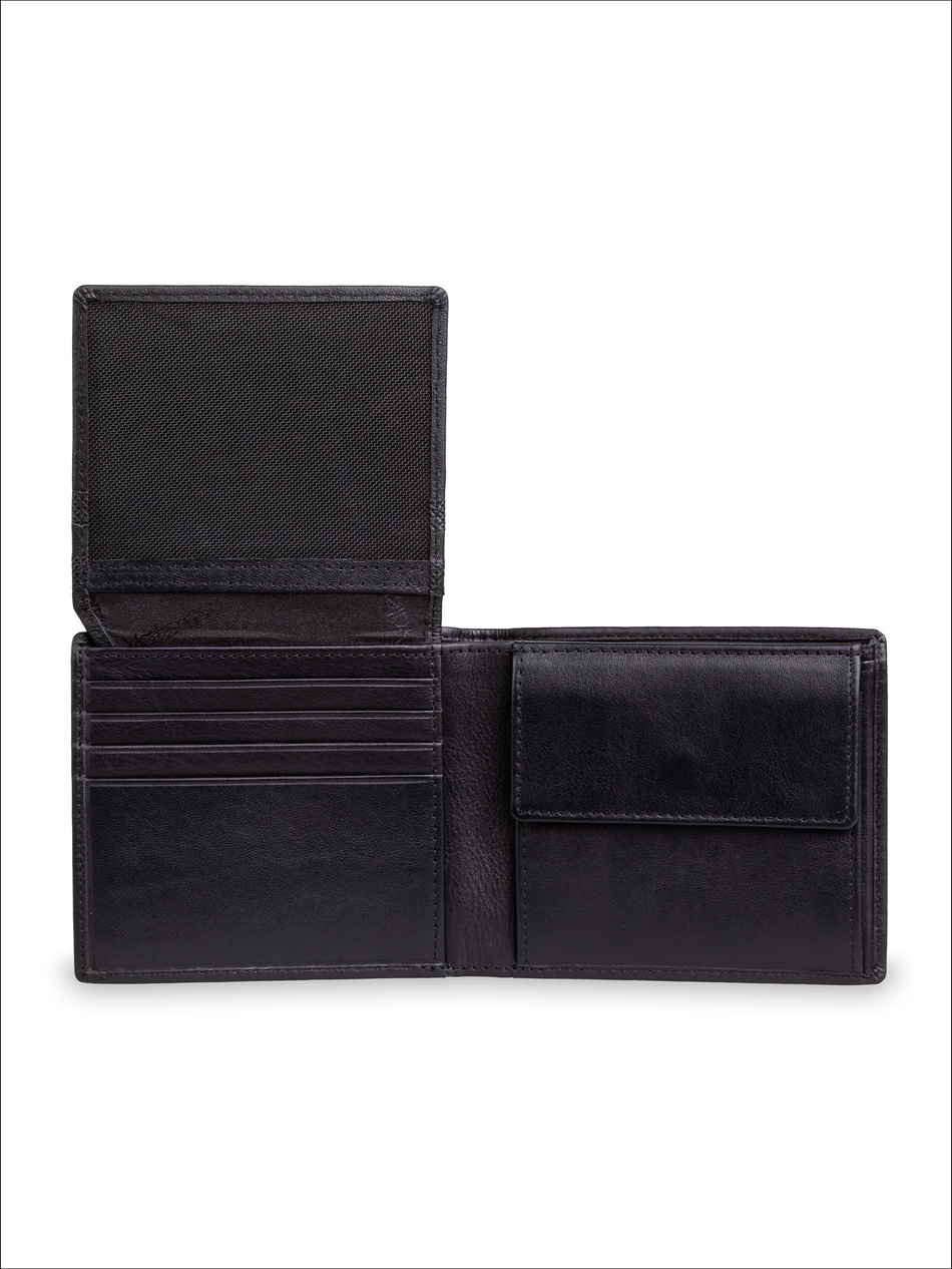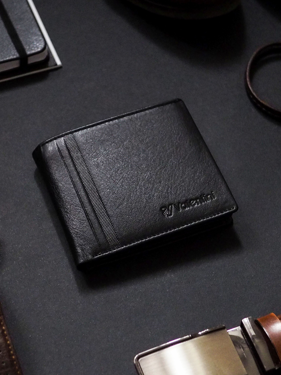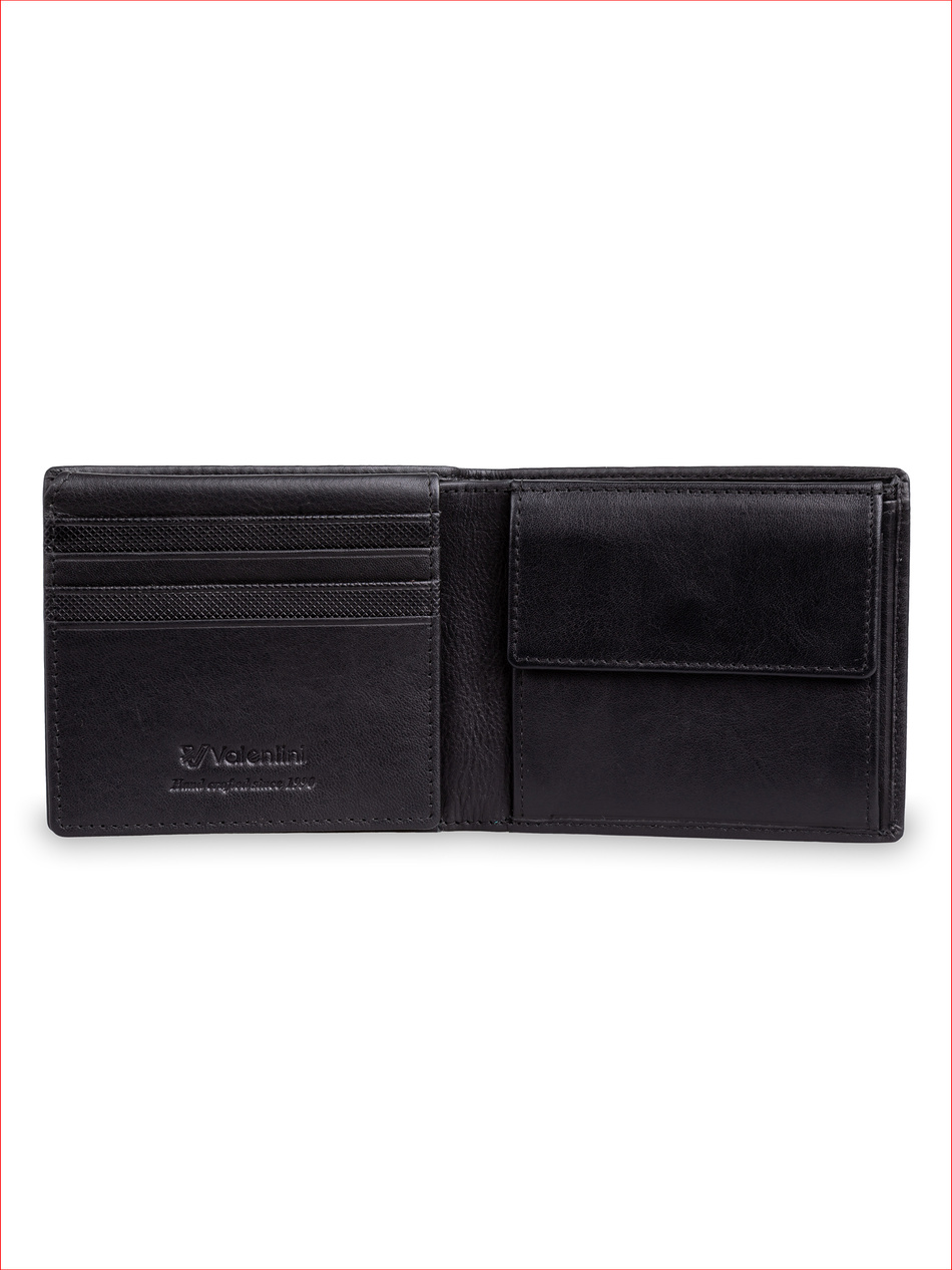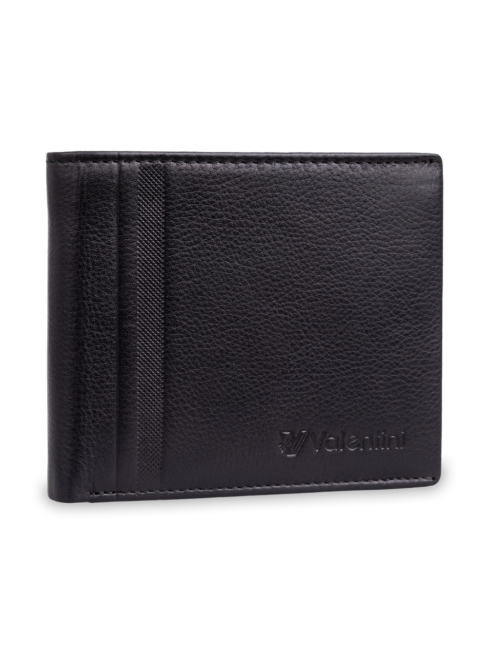 Męski portfel o układzie poziomym z kolekcji Trophy od Valentini wymiarów: 10,5 x 9 cm. Wewnątrz produkt posiada 3 miejsca na dokumenty, 8 na karty oraz kieszeń na bilon zamykaną na zatrzask. Na froncie znajduje się wytłoczone logo Valentini oraz fakturowany pasek – całość jest klasyczna, ponadczasowa a zarazem elegancka. Portfel został wykonany z wysokiej jakości skóry naturalnej.