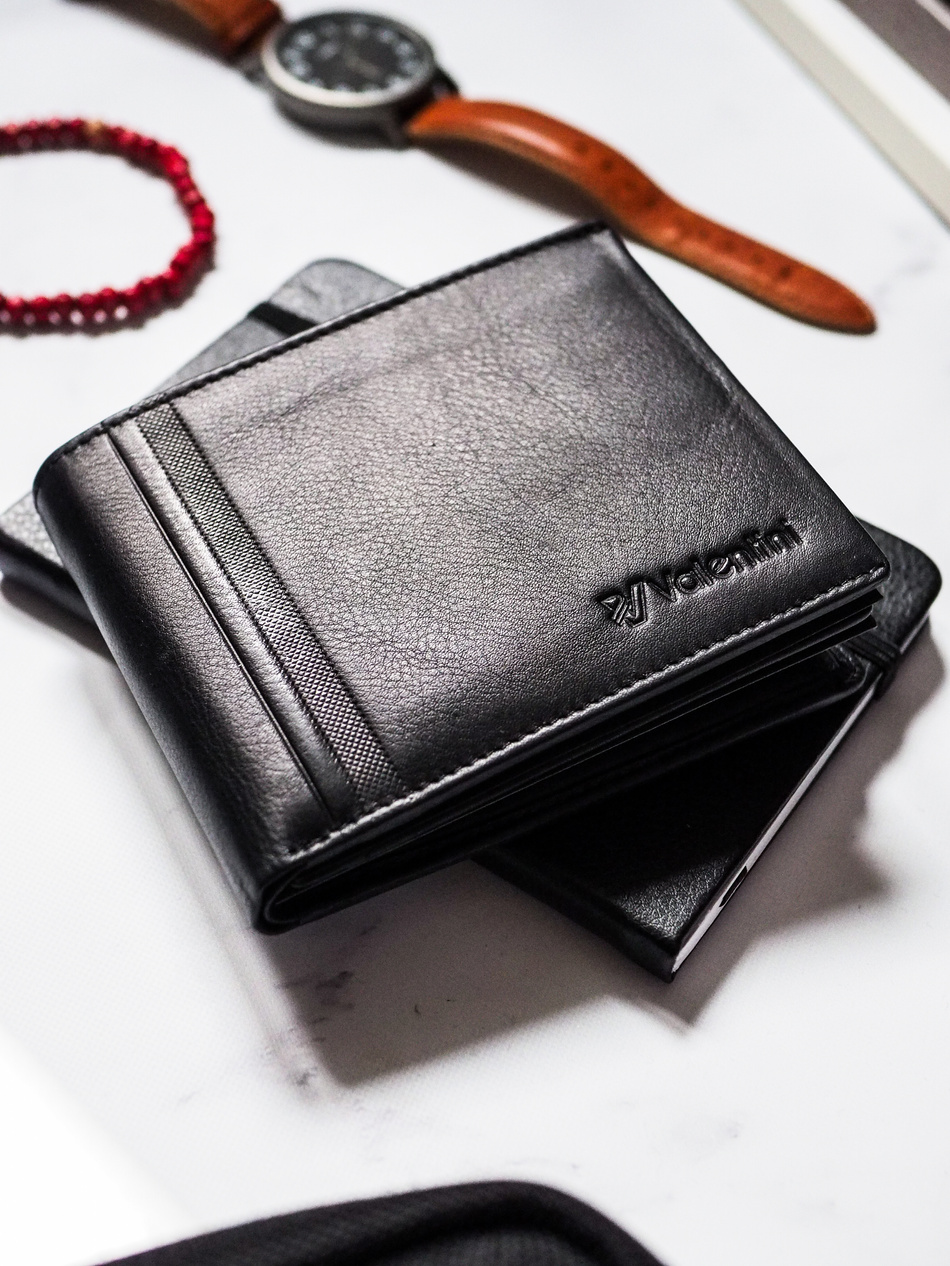 Męski portfel o układzie poziomym z kolekcji Trophy od Valentini wymiarów: 11 x 9 cm. Wewnątrz produkt posiada 4 miejsca na dokumenty, 6 na karty oraz kieszeń na bilon zamykaną na zatrzask. Na froncie znajduje się wytłoczone logo Valentini oraz fakturowany pasek – całość jest klasyczna, ponadczasowa a zarazem elegancka. Portfel został wykonany z wysokiej jakości skóry naturalnej.