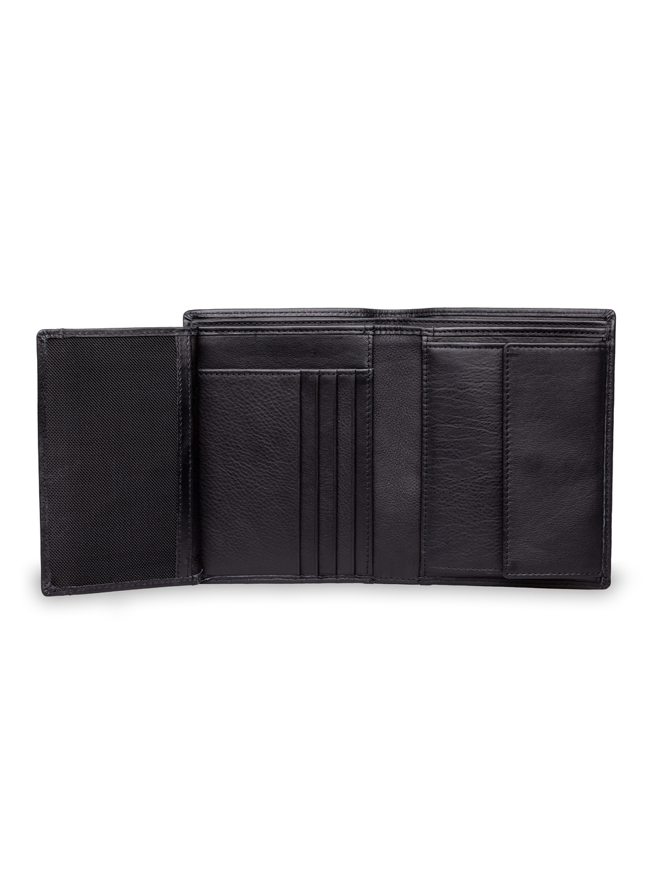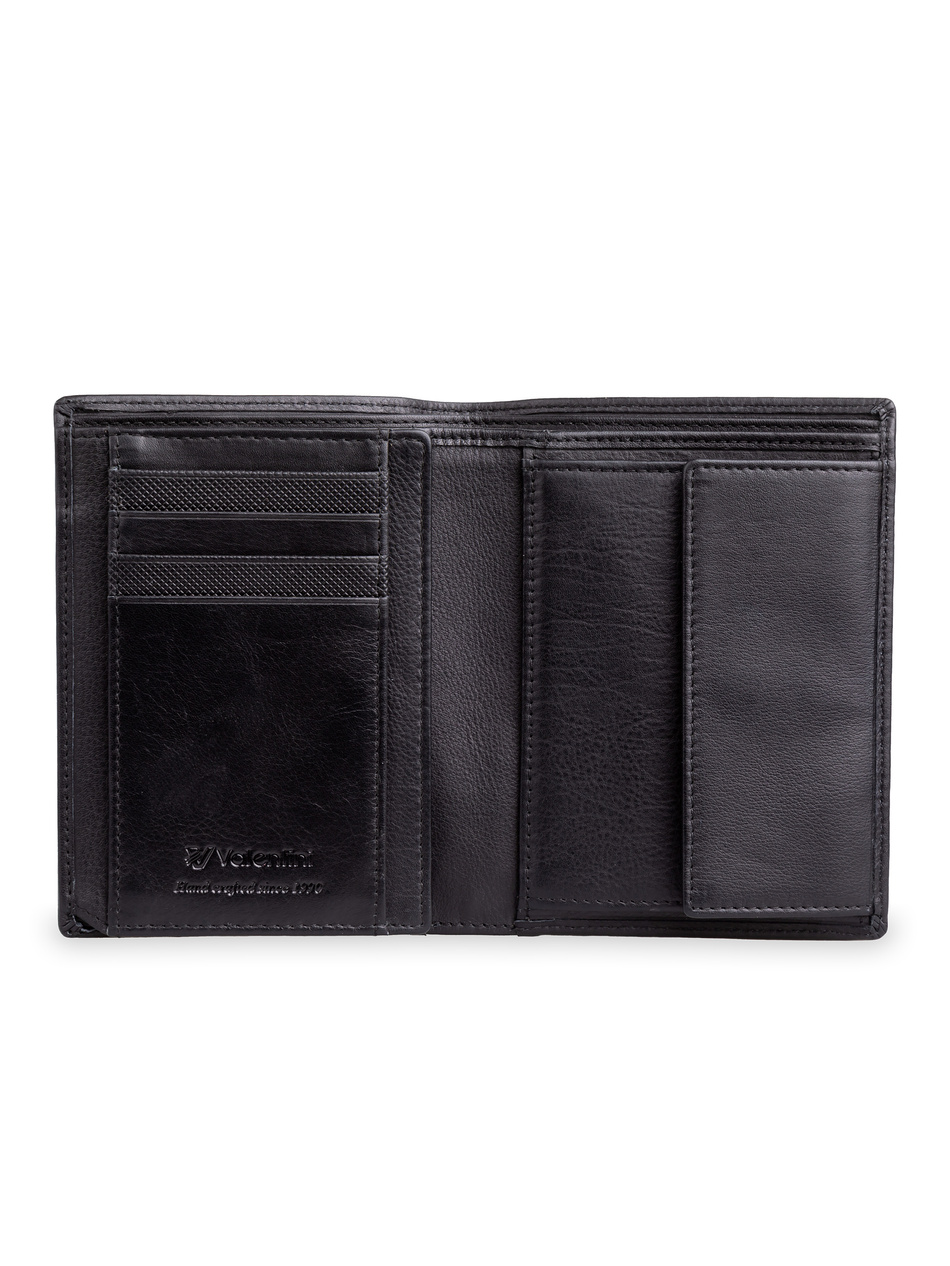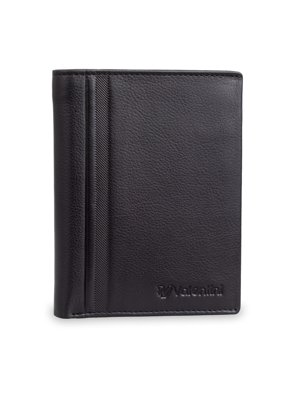 Męski portfel o układzie pionowym z kolekcji Trophy od Valentini wymiarów: 10 x 13 cm. Wewnątrz produkt posiada 5 miejsca na dokumenty, 8 na karty oraz kieszeń na bilon zamykaną na zatrzask. Na froncie znajduje się wytłoczone logo Valentini oraz fakturowany pasek – całość jest klasyczna, ponadczasowa a zarazem elegancka. Portfel został wykonany z wysokiej jakości skóry naturalnej.