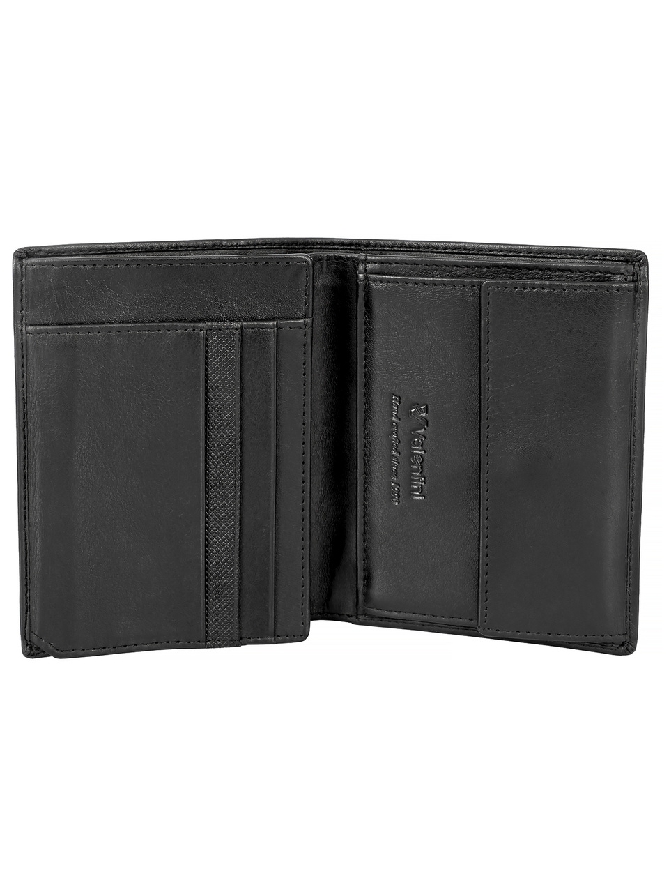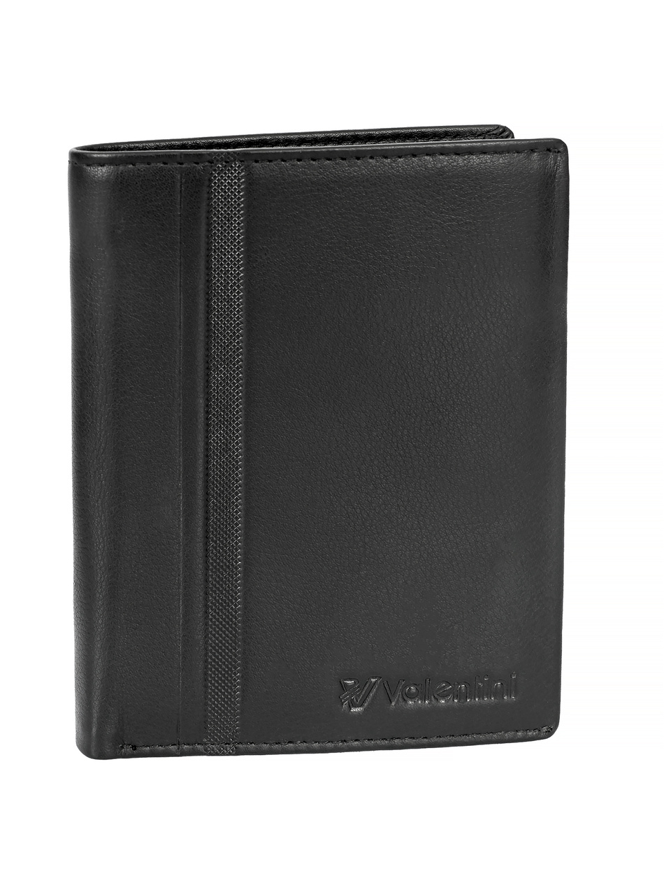 Męski portfel o układzie pionowym z kolekcji Trophy od Valentini wymiarów: 10 x 12,7 cm. Wewnątrz produkt posiada 5 miejsc na dokumenty, 6 na karty oraz kieszeń na bilon zamykaną na zatrzask. Portfel ma 2 przegrody na banknoty. Na froncie znajduje się wytłoczone logo Valentini oraz fakturowany pasek – całość jest klasyczna, ponadczasowa a zarazem elegancka. Portfel został wykonany z wysokiej jakości skóry naturalnej.