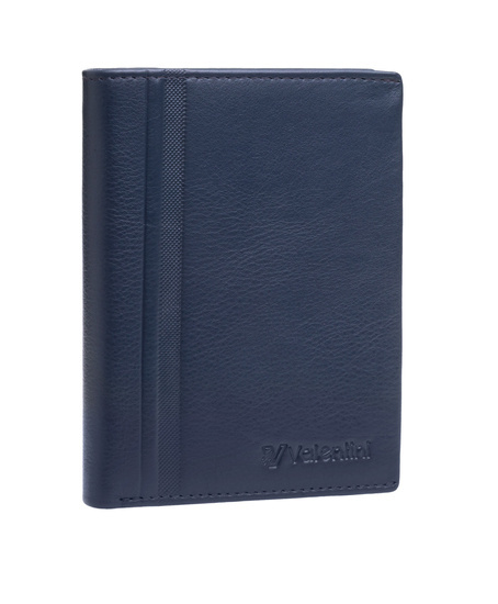 - Granatowy, pionowy portfel męski od Valentini z kolekcji Trophy wykonany ze skóry naturalnej.