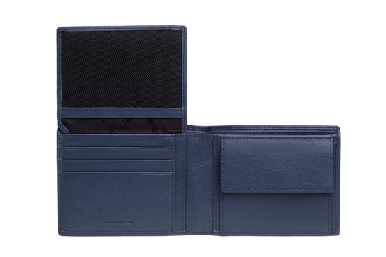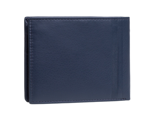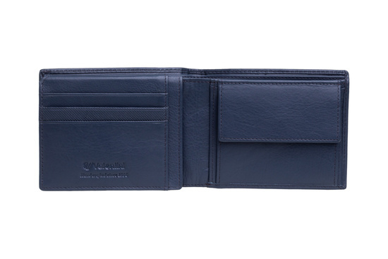 Męski portfel o układzie poziomym z kolekcji Trophy od Valentini o wymiarach 11 x 9 cm. Wewnątrz produkt posiada 4 miejsca na dokumenty, 6 miejsc na karty, 2 przegrody na banknoty oraz kieszeń na bilon zamykaną na zatrzask. Na froncie znajduje się wytłoczone logo Valentini oraz fakturowany pasek – całość jest klasyczna, ponadczasowa a zarazem elegancka. Portfel został wykonany z wysokiej jakości skóry naturalnej.