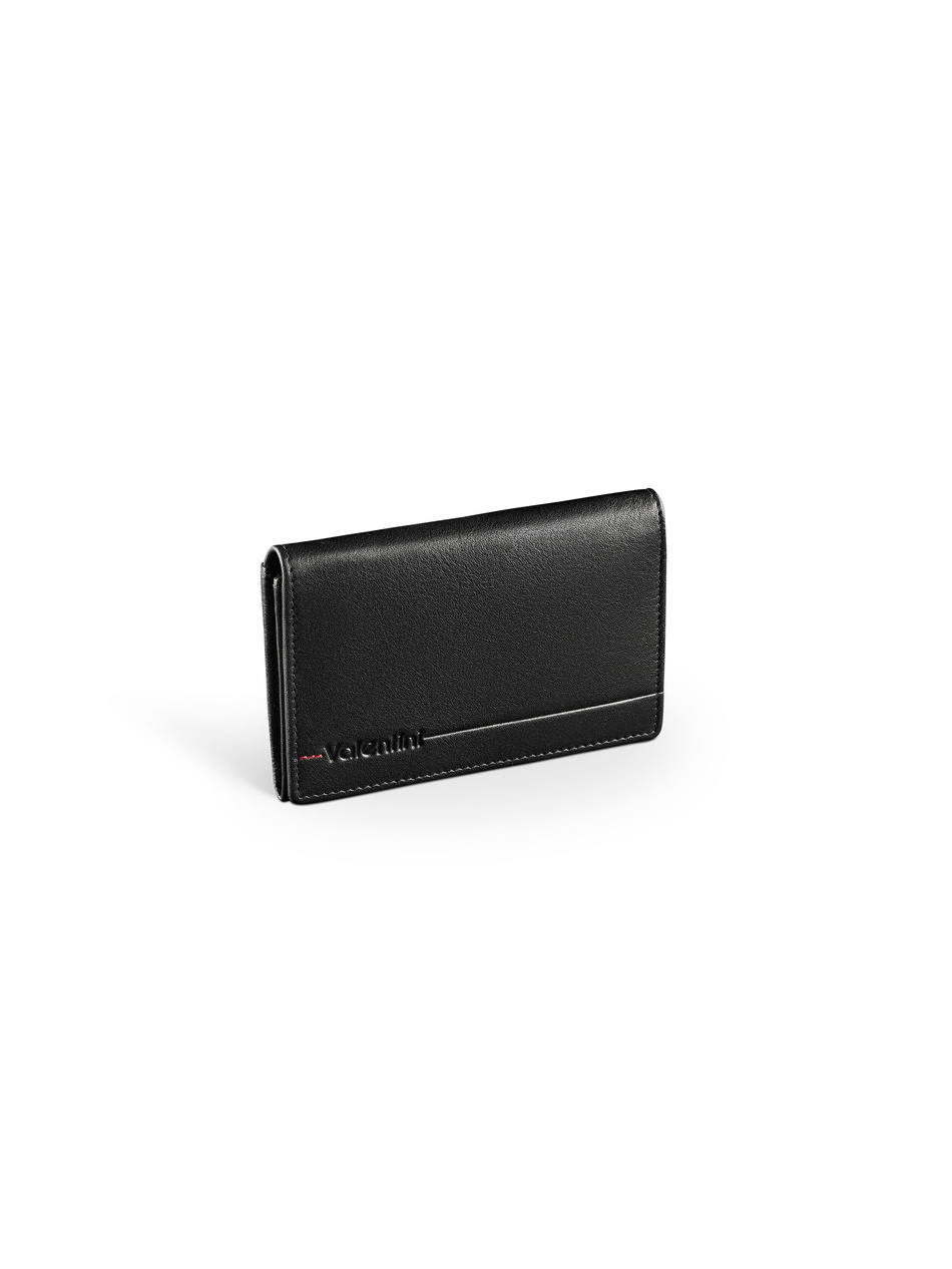 Czarne etui na wizytówki z kolekcji Mild od Valentini to elegancki dodatek, który pomoże utrzymać porządek w torebce lub plecaku. Produkt zamykany jest na zatrzask, posiada dwa miejsca na karty, jedną kieszeń zewnętrzną oraz przegrodę na wizytówki, a wykonany został z najwyższej jakości skóry naturalnej.