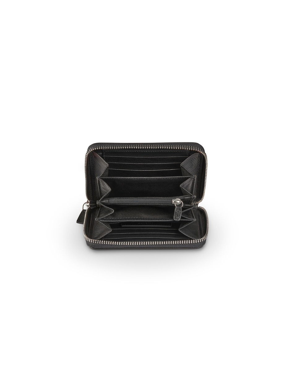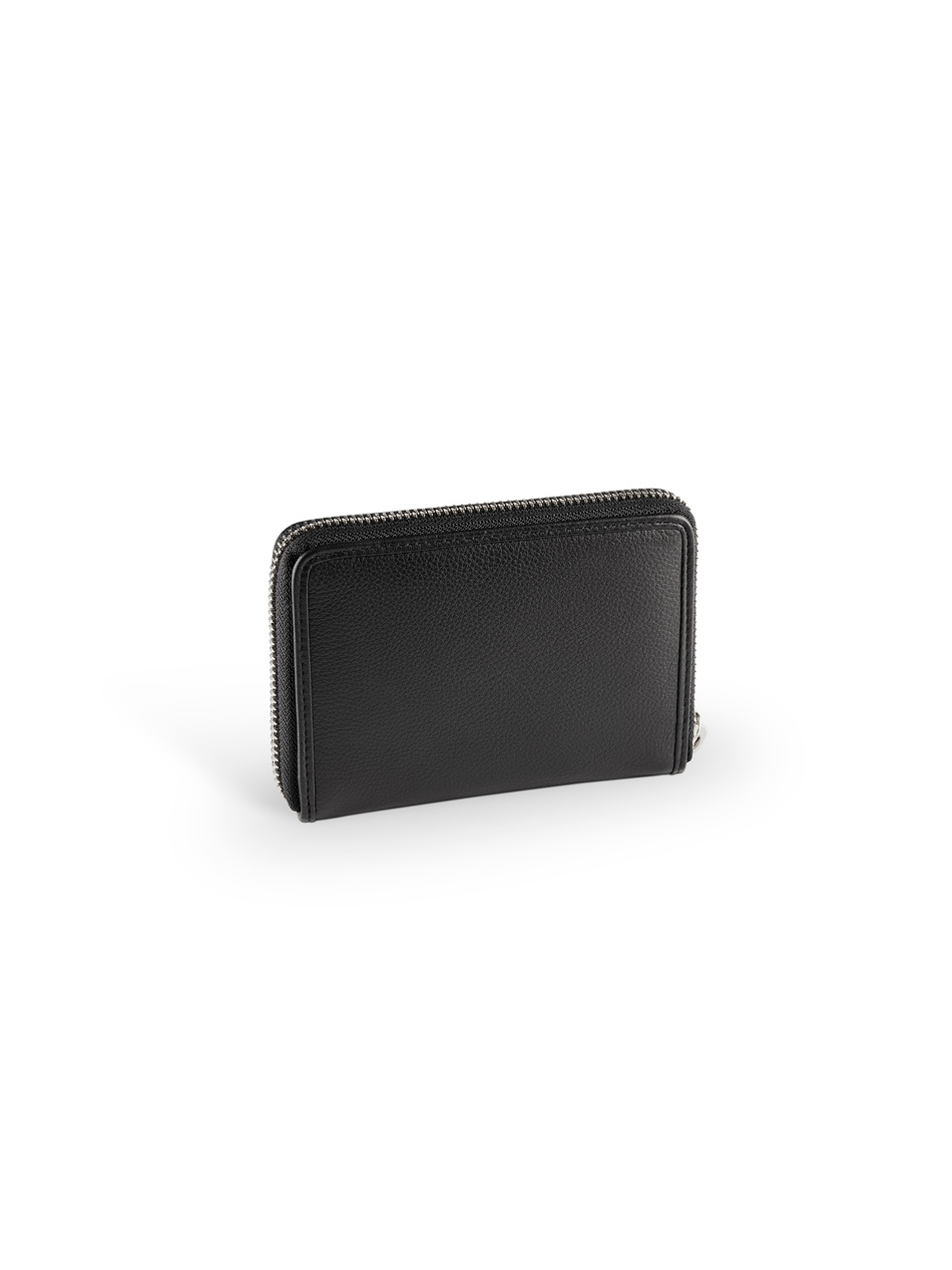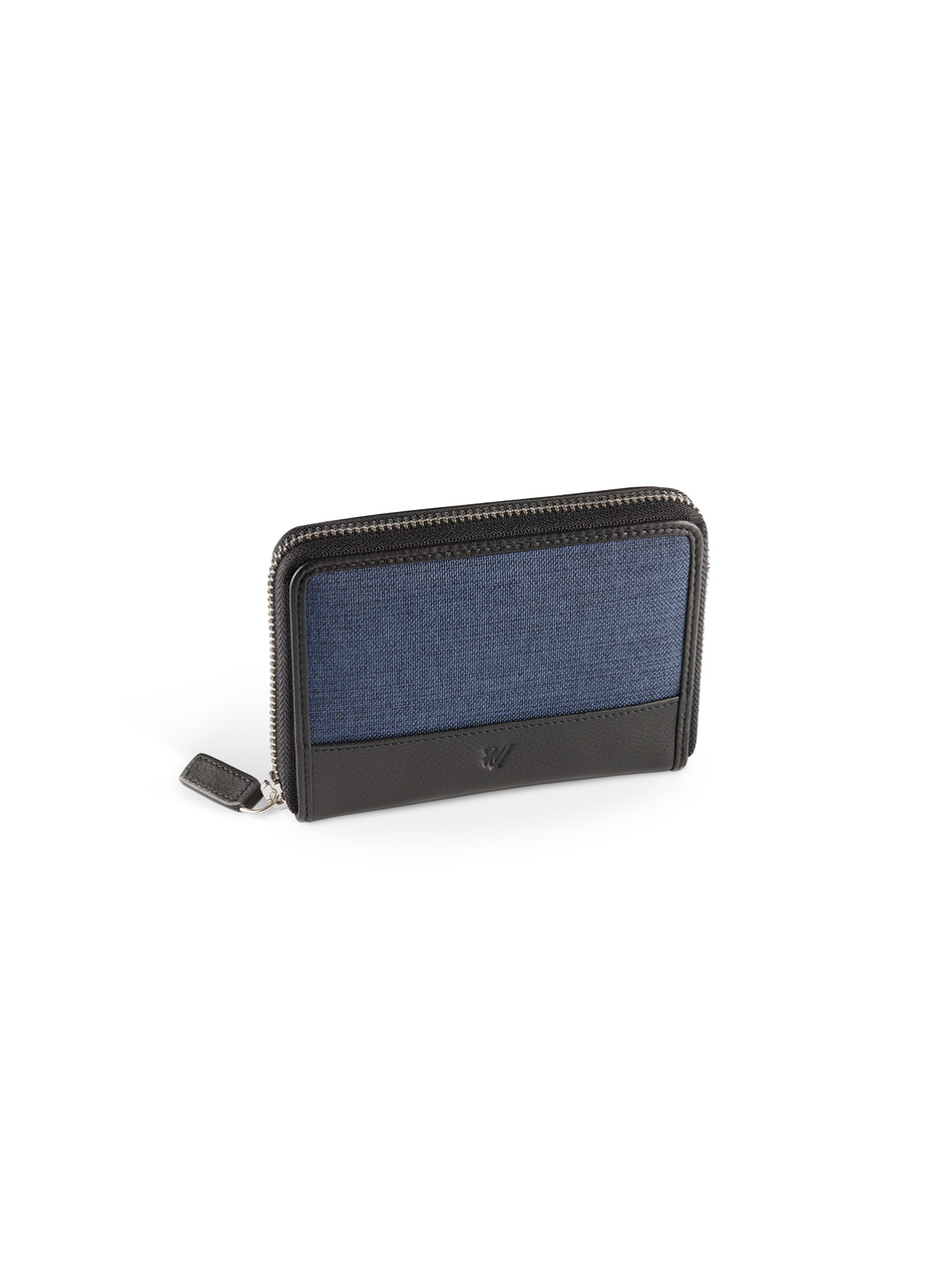 Damski portfel z kolekcji Fusion od Valentini w wymiarach 13,5 x 9,5 cm zapinany na zamek. Wewnątrz harmonijka, która posiada 4 pojemne przegrody np. na banknoty, dokumenty, bądź ważne paragony. Kieszonka na bilon zapinana na zamek oraz aż 8 miejsc na karty. Portfel został wykonany z połączenia dwóch materiałów, wysokiej jakości skóry naturalnej w ponadczasowym, czarnym kolorze oraz płótna w kolorze granatowym. Na froncie widnieje również wytłoczone logo firmy Valentini. Wszystkie portfel z kolekcji Fusion wyróżniają się casualowym designem, który świetnie sprawdzi się jako prezent dla młodych dorosłych.