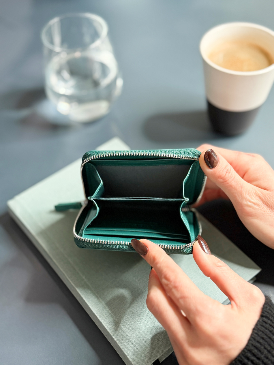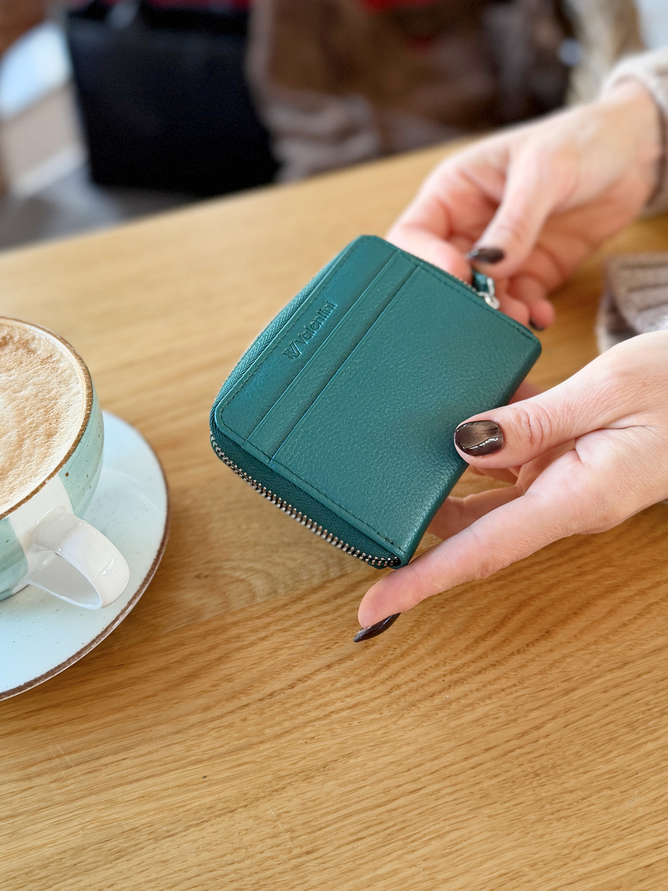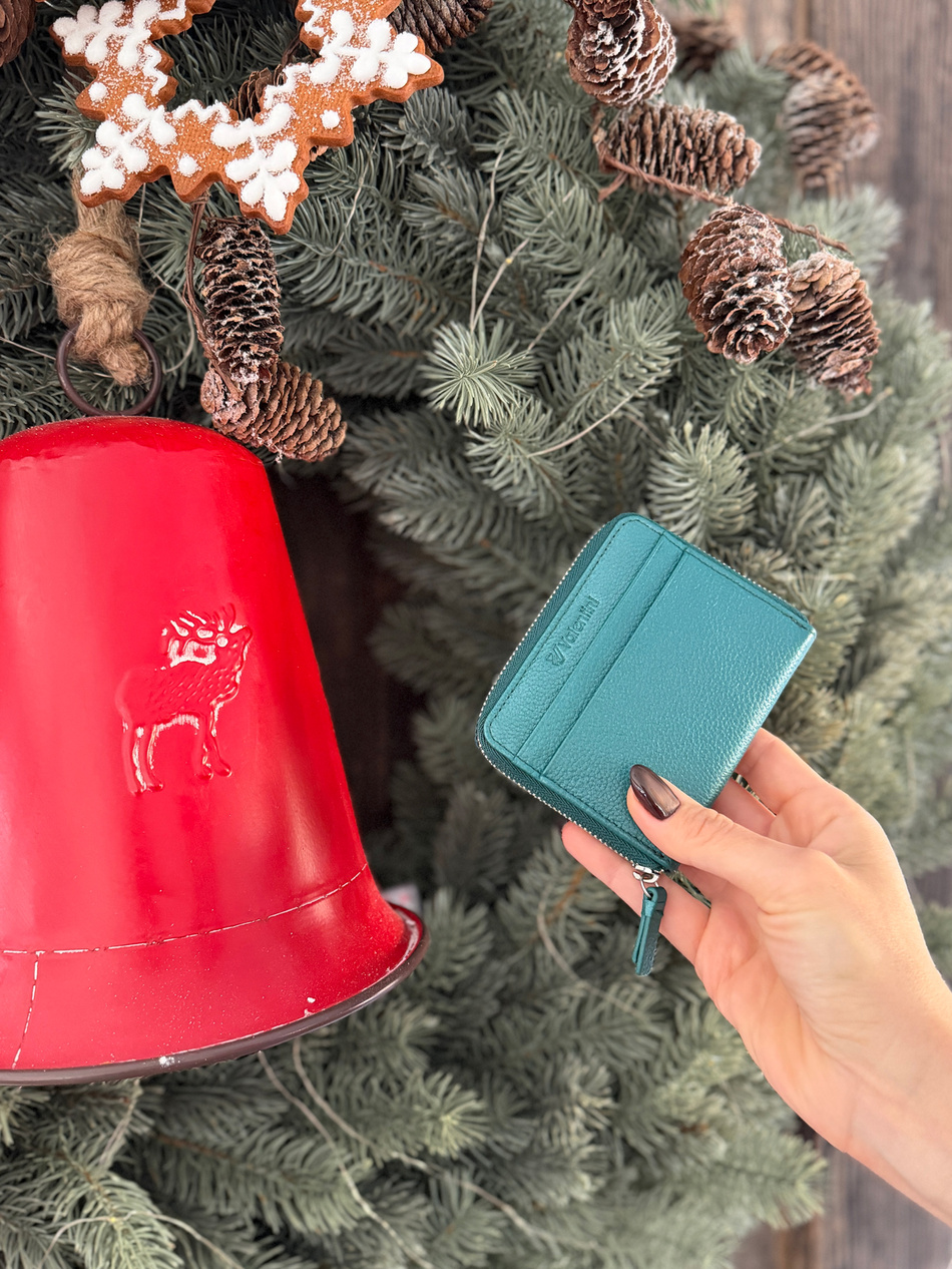 - Portfel ze skóry naturalnej dla praktycznych kobiet – kompaktowy z 7 miejscami na karty, kieszenią na bilon i ochroną RFID, idealny do małych torebek i codziennych płatności.