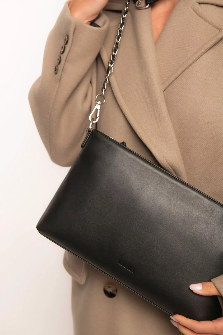 - Skórzana torebka damska na ramię w kolorze czarnym z okuciami w kolorze srebrnym.