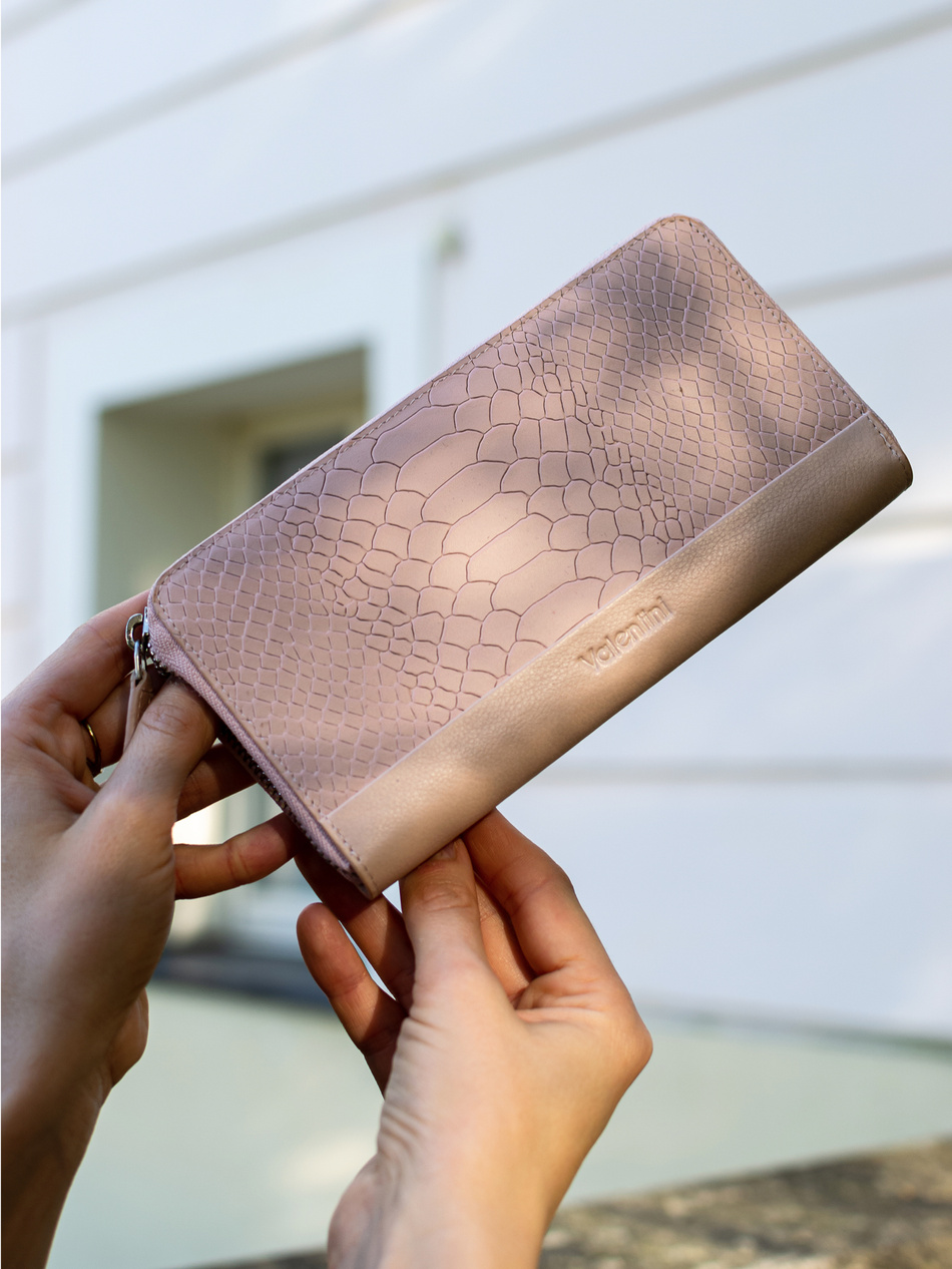 Odkryj duży portfel damski Valentini, który łączy w sobie luksus i praktyczność. Wykonany z najwyższej jakości skóry naturalnej, ten portfel nie tylko wyróżnia się swoją trwałością, ale także unikalnym designem z printem wężowej skóry, dodającym mu wyjątkowego charakteru.