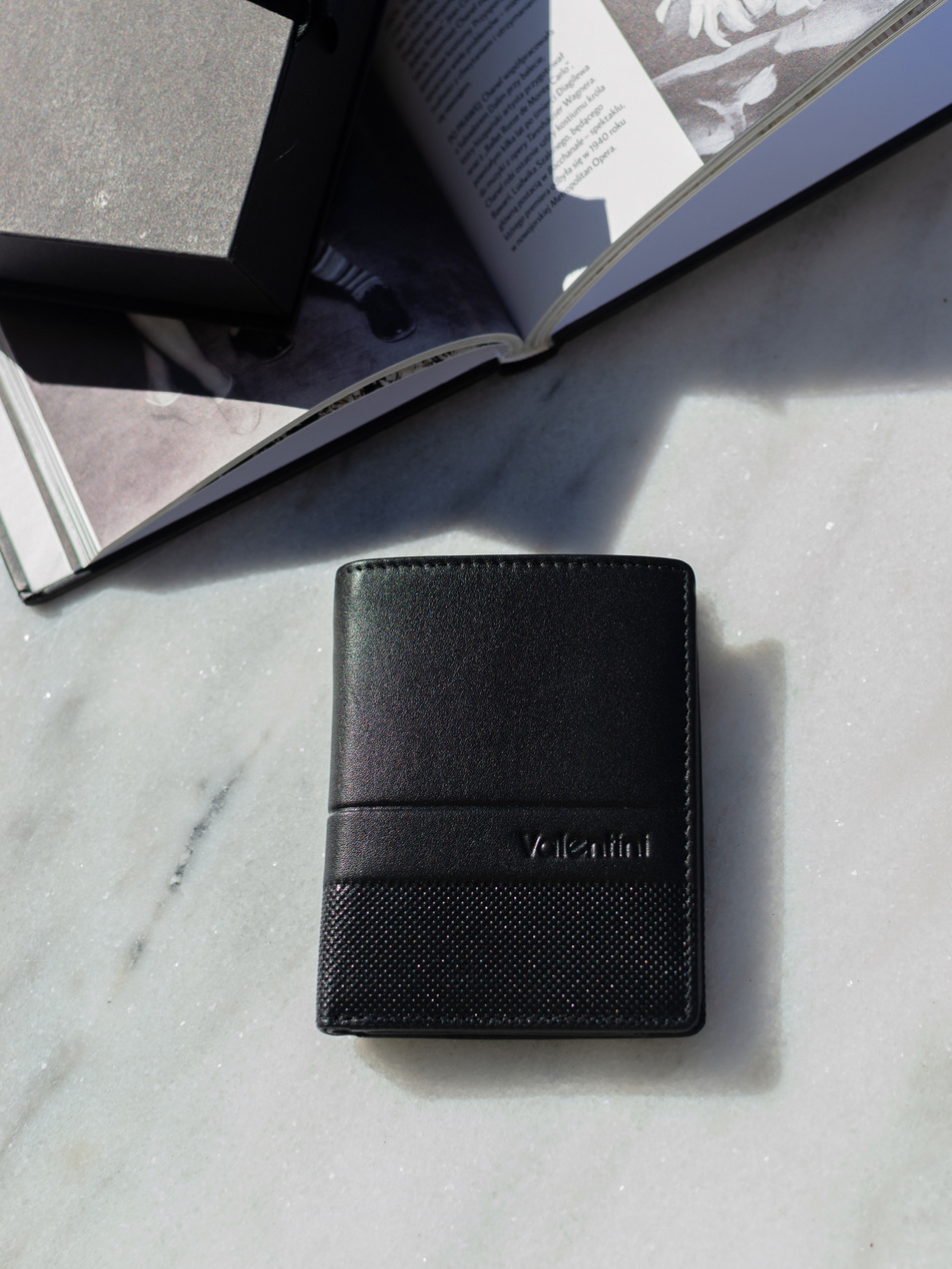 Ten męski portfel skórzany bez kieszonki na monety to elegancka propozycja dla osób ceniących minimalistyczny styl i wysoką jakość. Wykonany z gładkiej, czarnej skóry, portfel łączy prosty design z subtelnym, teksturowanym wykończeniem w dolnej części, co nadaje mu wyjątkowego charakteru. Klasyczna czerń sprawia, że doskonale pasuje do każdej stylizacji, od casualowej po formalną.