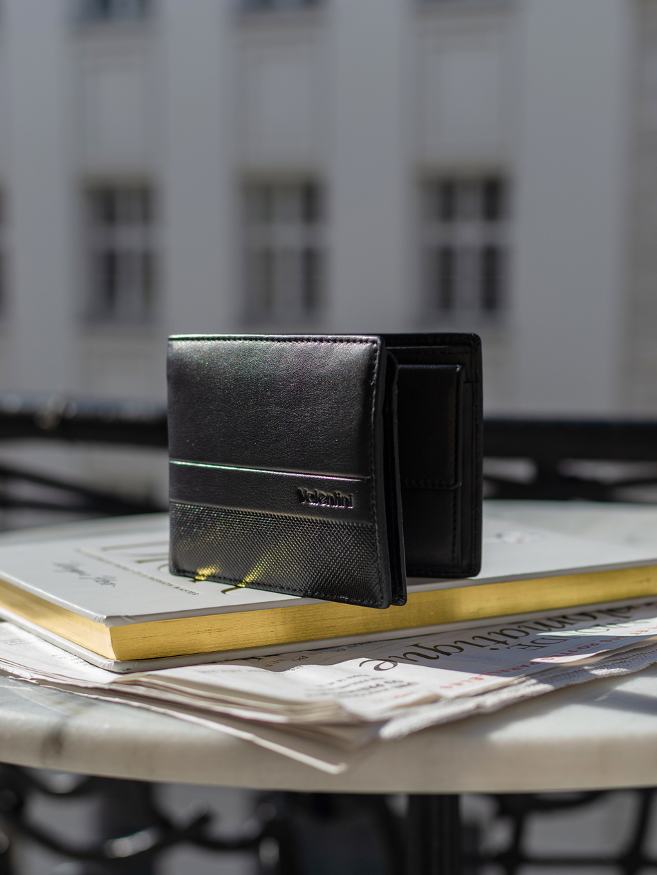 Ten męski portfel z kolekcji Yew II to idealne połączenie klasy i praktyczności. Wykonany z wysokiej jakości skóry, charakteryzuje się subtelnym designem, który łączy gładką powierzchnię z delikatnie teksturowanym akcentem. Klasyczna czerń nadaje mu elegancki wygląd, który doskonale komponuje się z każdą stylizacją, od codziennej po bardziej formalną.