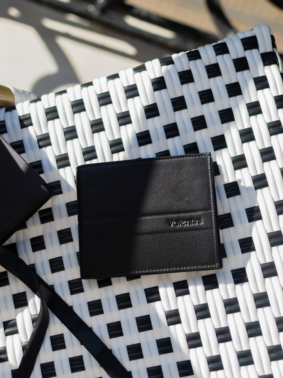 Ten męski skórzany portfel z kieszenią na monety wyróżnia się eleganckim i minimalistycznym designem. Wykonany z wysokiej jakości skóry, łączy gładką powierzchnię z delikatnym, teksturowanym akcentem w dolnej części. Klasyczna czerń nadaje mu ponadczasowy charakter, który doskonale pasuje zarówno do codziennych, jak i formalnych stylizacji.
