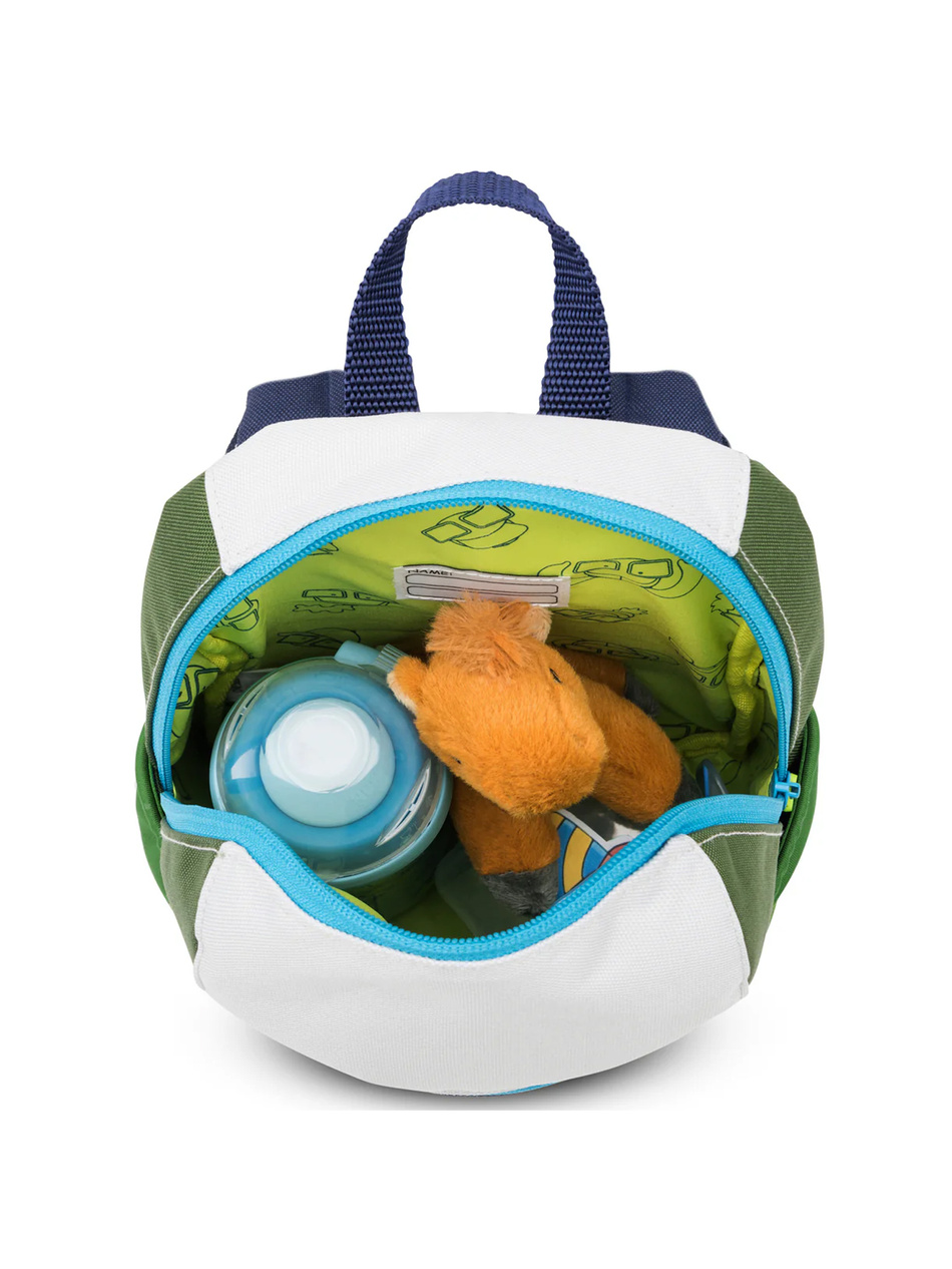 - Praktyczna organizacja – główna komora na lunchbox i ulubione zabawki, wewnętrzna kieszonka na drobiazgi, boczne kieszenie na butelkę