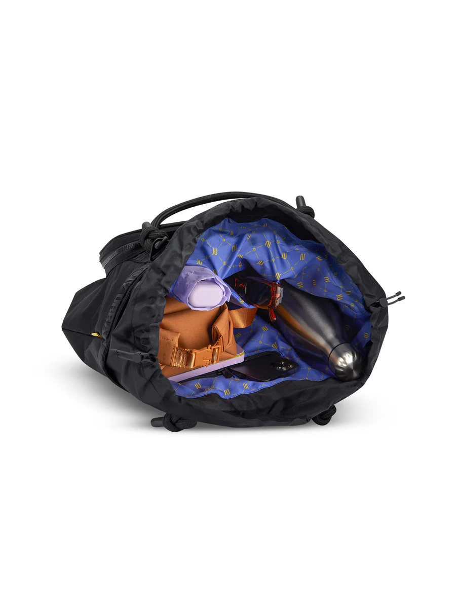 - Komory/kieszenie: główna przestrzeń z 3 kieszeniami wewnętrznymi; kieszeń na suwak z przodu; kieszeń z tyłu; boczne przegrody na butelki