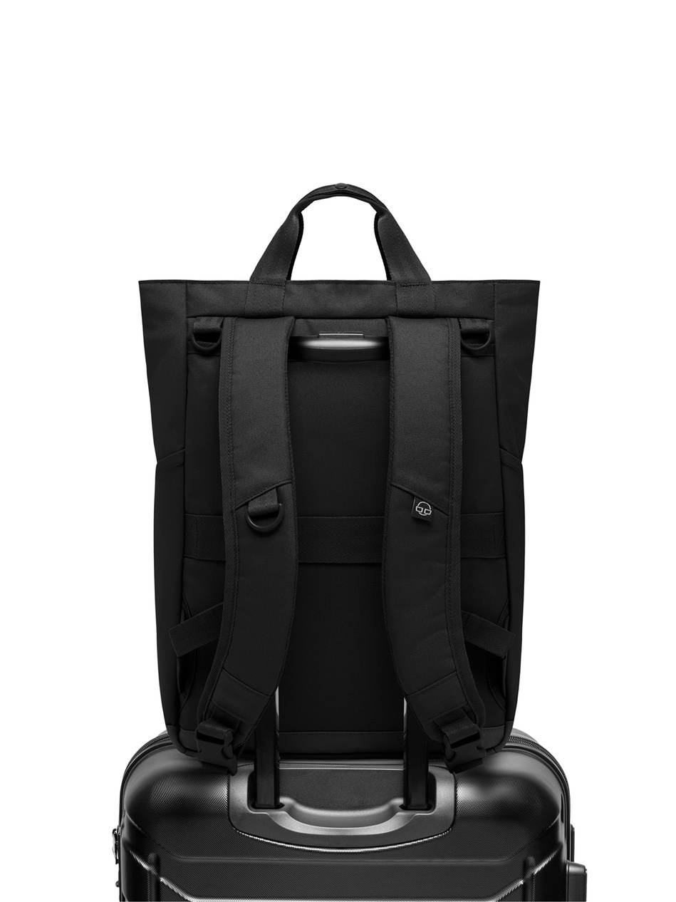 • Stylowa torba-plecak do wózka 2w1 z wodoodpornego materiału, z miejscem na laptop 15,6″, praktycznymi kieszeniami i systemem do noszenia na walizce.