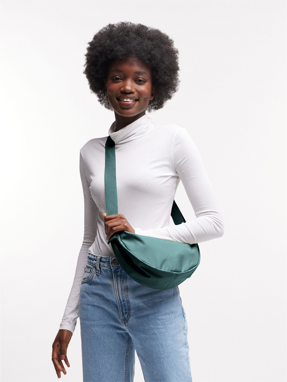 - Mała torba crossbody typu half-moon. Wykonana z wodoodpornego materiału RE:PET.